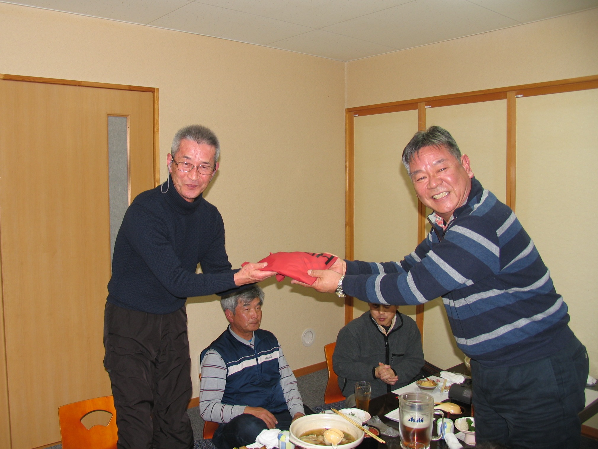 途中、岡村夫妻からの送別の品が大場くんに渡されました。