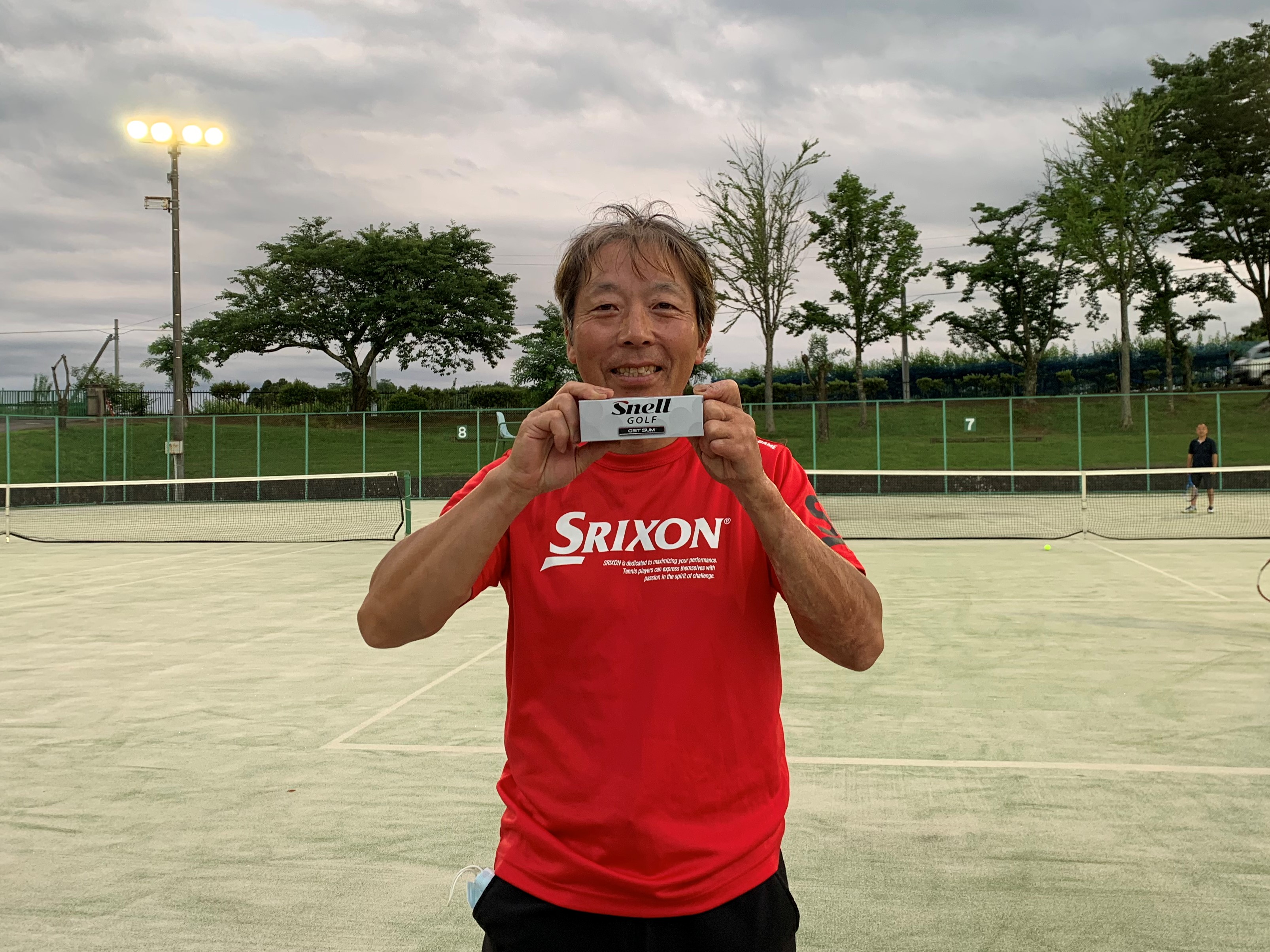 今回は、ナイター練習のコート確保のために、毎回、牡丹台庭球場に出向いて予約カードを取ってくださっていた「佐藤祥樹」さんに『功労賞』を贈らせていただきました。