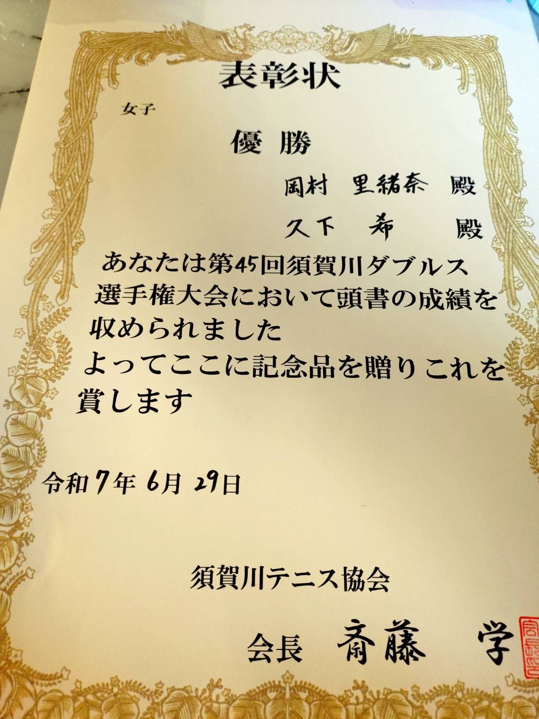 6月29日に牡丹台庭球場で行われました『第45回須賀川ダブルス選手権大会』の女子の部において、久下希/岡村里緒奈ペアが見事優勝しました!